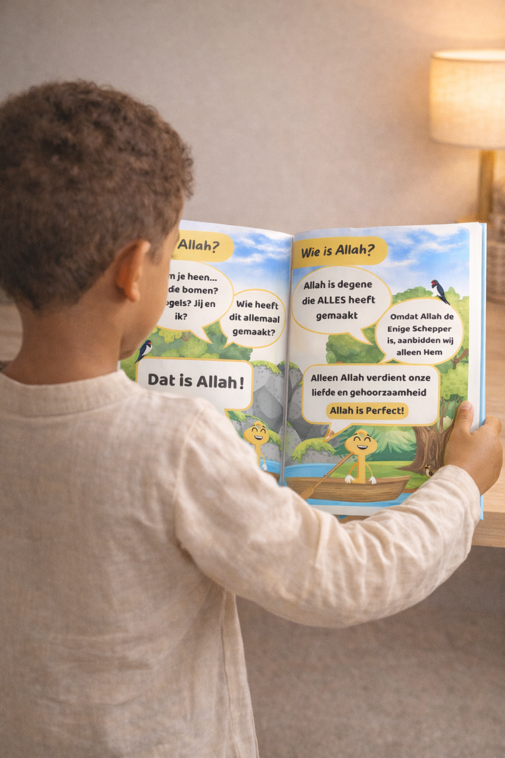 Leer Tawheed samen met mij is een warm en speels kinderboek dat ouders en kinderen samen meeneemt in het ontdekken van Allah ﷻ — door verhalen, vragen, illustraties en activiteiten die aansluiten bij jonge harten en nieuwsgierige geesten.